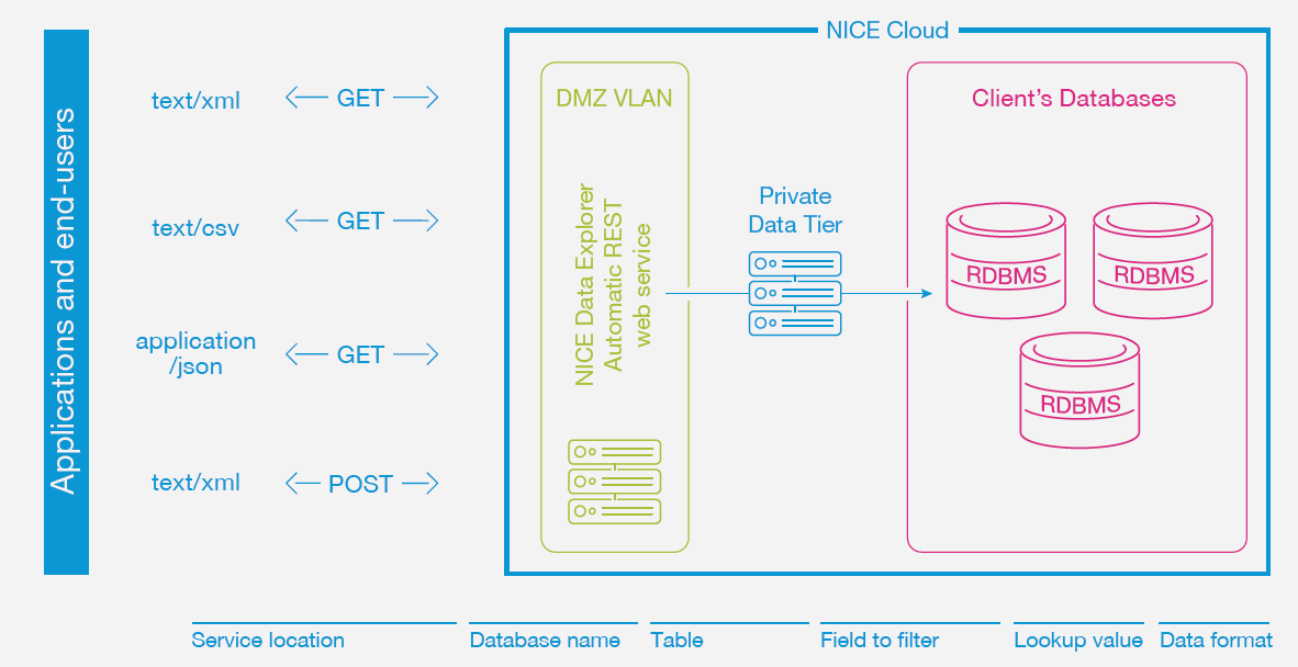 NICE Data Explorer is an easy to use web API, which translates relational database structures into a logical library of uniform resource locators (URLs). Conforming to REST methodology, each piece of data has its own unique identifying URL regardless of whether it is a simple scalar value or a nested structure of related records.